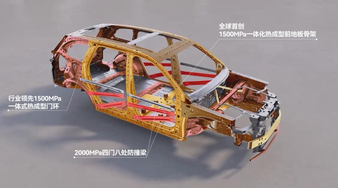 在车身结构上,华境S整车高强钢及铝合金占比超过85%,其中近30%为热成型超高强钢。通过与宝钢合作,车辆采用1500MPa一体式热成型前地板骨架及门环,并配备十宫格结构挤压铝门槛加强梁,四门处还增设2000MPa防撞梁。车身采用五纵十一横六环笼式结构,以提升抗撞击与抗扭曲能力。
