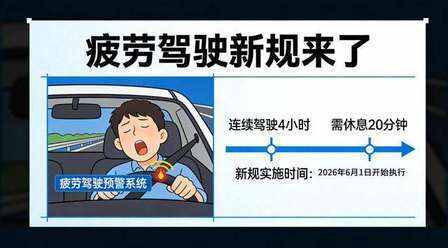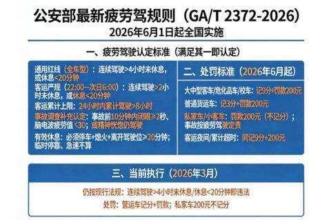 不管你是天天跑长途的老司机,还是偶尔开车代步的私家车主,公安部发布的《机动车驾驶人疲劳驾驶认定规则》(GA/T 2372-2026),从今年6月1日起全国统一执行。